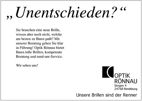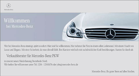 Den Anfang macht eine Stellenanzeige für Mercedes-Benz im Manager-Magazin sowie eine Anzeige für einen Optiker, die im „Kicker“ erscheinen sein könnte.