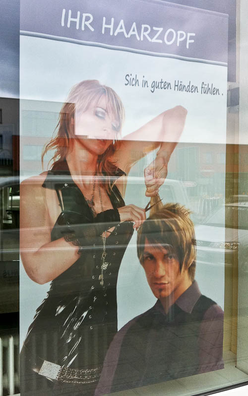 Da haben es die Betreiber wohl gut gemeint und sich ihre Werbung selbst geschustert und sogar hochwertig und großformatig Ausbelichten lassen – nur beim Fotografen scheinen sie gewaltig gespart zu haben, denn der ist hier vollkommen untalentiert am Ziel vorbeigeschossen. Übrigens ist mir dabei noch ein wunderschöner, lokalpatriotischer Name für einen Frisiersalon in Essen und Umgebung eingefallen: „Pottschnitt“.