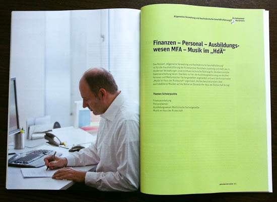 Professionelle Fotos lassen Ihre Publikationen lebendig erscheinen: Stilistisch homogene Fotos Ihres Unternehmens lockern die Fakten eines Geschäftsberichts auf, lenken die Blicke auf Ihre Markenwerbung und verleihen Ihren Produktbroschüren eine menschliche Seite. Sie kommuniziert auf vielen Wegen, sei es PR, Jahresbericht, Imagebroschüre, Kundenmagazin oder Mitarbeiterzeitschrift – nutzen Sie die visuelle Überzeugungskraft von Fotos für Ihr Unternehmen! Gönnen Sie Ihrem Bericht z.B. wie oben eine großzügige Doppelseite mit einem Gruppenfoto Ihrer Mitarbeiter. Mehr Bildbeispiele finden Sie hier: Galerie Geschäftspublikationen