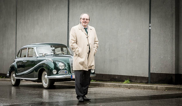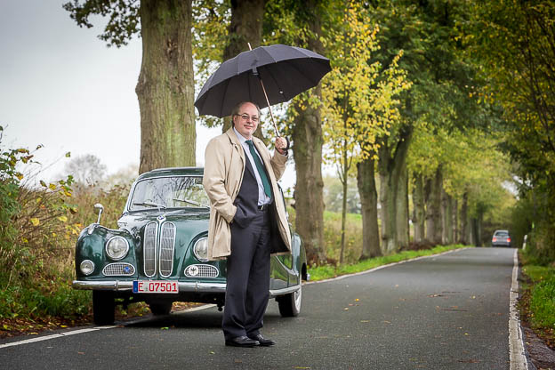Fotos kann ja jeder. Der große Unterschied zum Amateur ist, dass man als Profifotograf gute Fotos abliefern muss. Da zählen keine Ausreden, zu wenig Platz auf der Speicherkarte oder schlechtes Wetter. Heute morgen musste ich mit einer solchen Herausforderung umgehen – jeder Laie hätte sich entschuldigt und wäre Kaffee trinken gegangen. Der Auftrag lautete, einen Rechtsanwalt und Dozenten zu portraitieren, der Seminare für Geschäftsführer anbietet. Für das Shooting war ein liebevoll restaurierter BMW-Oldtimer organisiert, der symbolisieren sollte, dass hervorragende Qualität überdauert. Bei der Location-Suche hatte ich bereits gestern festgestellt, dass Burgaltendorf nicht zu den fotogensten Ecken Essens gehört. An dieser Stelle hätte der nächste Smartphone-Knipser aufgegeben. Die Wettervorhersage drohte bereits Nässe an, und tatsächlich nieselte es heute früh vor Ort. Wer hätte jetzt noch Lust gehabt, seine tolle, neue Digitalkamera herauszuholen? Ich schon, denn ich hatte einen Auftrag zu erfüllen. Und so zauberten wir zunächst an zwei Standorten Motive mit eigenem Charakter und flüchteten anschließend vor dem Sturzregen in die Werkstatt …