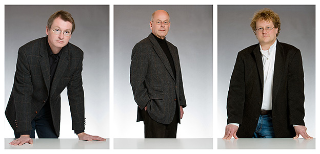 Damit sich im Businesskontext mehrere Portraitfotos harmonisch zueinander fügen, sollten Beleuchtung, Farbtemperatur, Ausschnitt und Hintergrund ähnlich sein. Das bedeutet allerdings nicht, alle Personen des Vorstands zwanghaft identisch ablichten zu müssen. Mein Beispiel verdeutlicht dies: Ich habe bewusst die Tischkante in das Bildkonzept einbezogen – sie taucht bei allen Bildern auf und ist an gleicher Stelle positioniert. Dennoch unterscheiden sich die Posen der drei Personen und die Einbeziehung des Tischs in das Motiv.