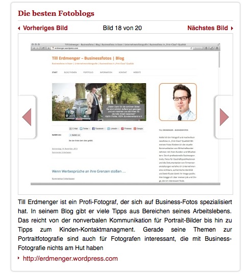 Zum wiederholten mal wurde mein Blog von der Zeitschrift Macwelt als einer der besten Fotoblogs Deutschlands ausgezeichnet! Ich freue mich über diese Ehre und Anerkennung und habe aus diesem Anlass einmal nachgesehen, welche meiner Beiträge im vergangenen Jahr die größte Resonanz hervorgerufen haben. Die Top-10-Beiträge mit den meisten Klicks sind folgende: