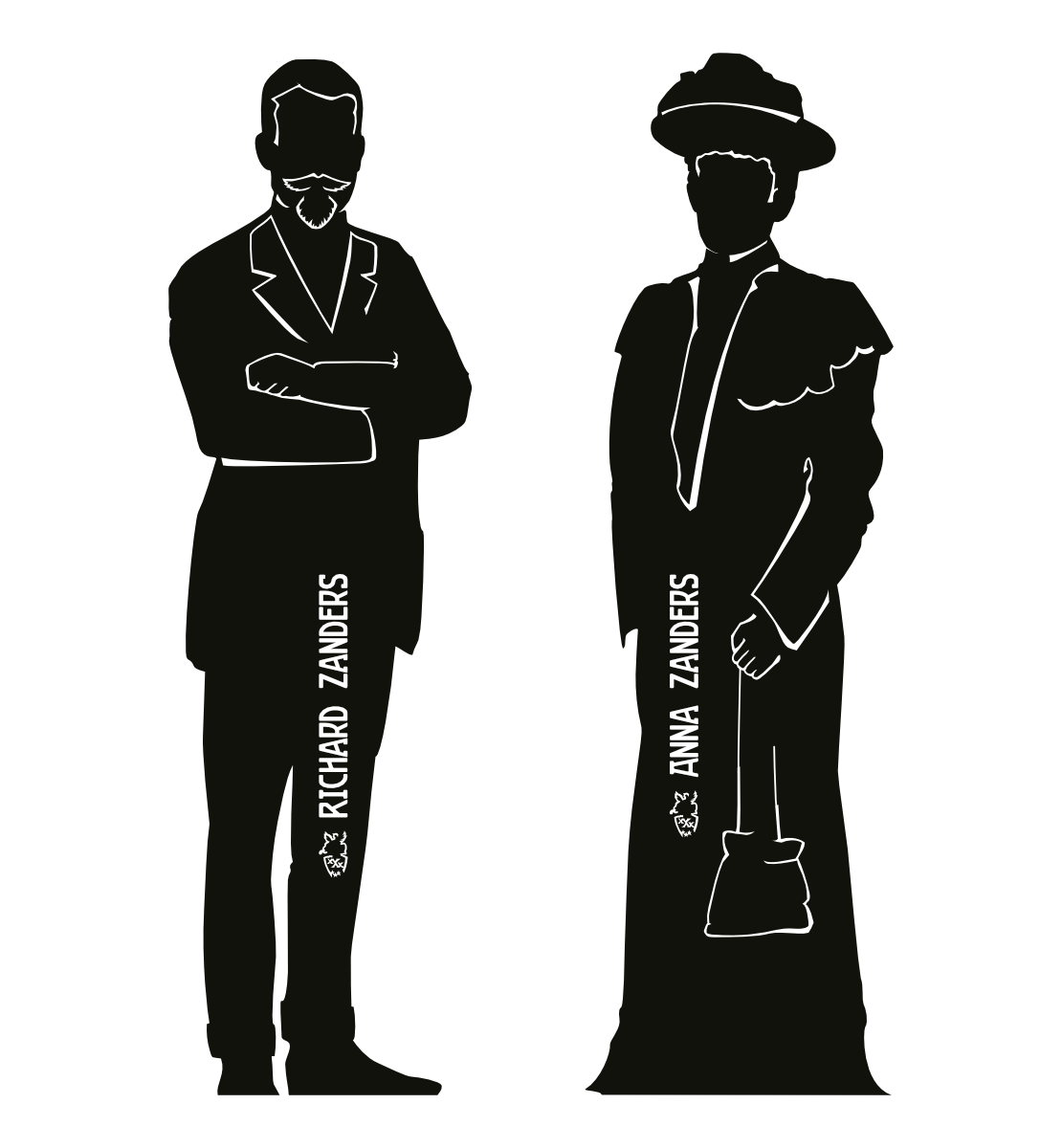 Die Figuren sollten die beiden Siedlungsgründer Anna und Richard Zanders darstellen, von denen ich mehrere Portrait-Fotos und Gemälde als Vorlage habe. Da es keine Ganzkörperdarstellungen sind, mußte ich nach zeitgenössischen Abbildungen suchen, die ich dann als Schattenriss nachzeichnete. Schließlich habe ich einige Details als Konturen eingearbeitet – diese werden per Laser aus den Figuren ausgeschnitten. Zur optischen Klarstellung ergänzte ich die Namen der beiden Personen sowie das frühere „Gohrsmühle“-Wasserzeichen, daß einmal die Feinpapiere der Firma Zanders schmückte.