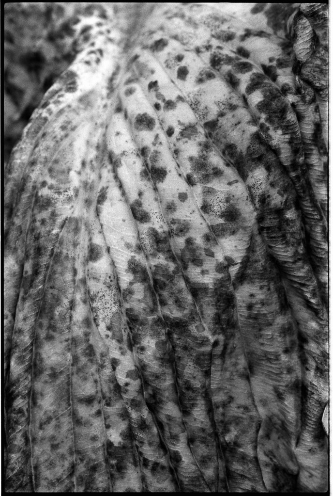 Belichtet mit einer Canon A1, FDn 4,0/100mm Makro, entwickelt in Caffenol Delta für 12:00, gescannt mit Vuescan und Epson 700, bearbeitet in Lightroom mit Negative Lab Pro. Verwelkte Blätter einer Fuchsie im Garten.