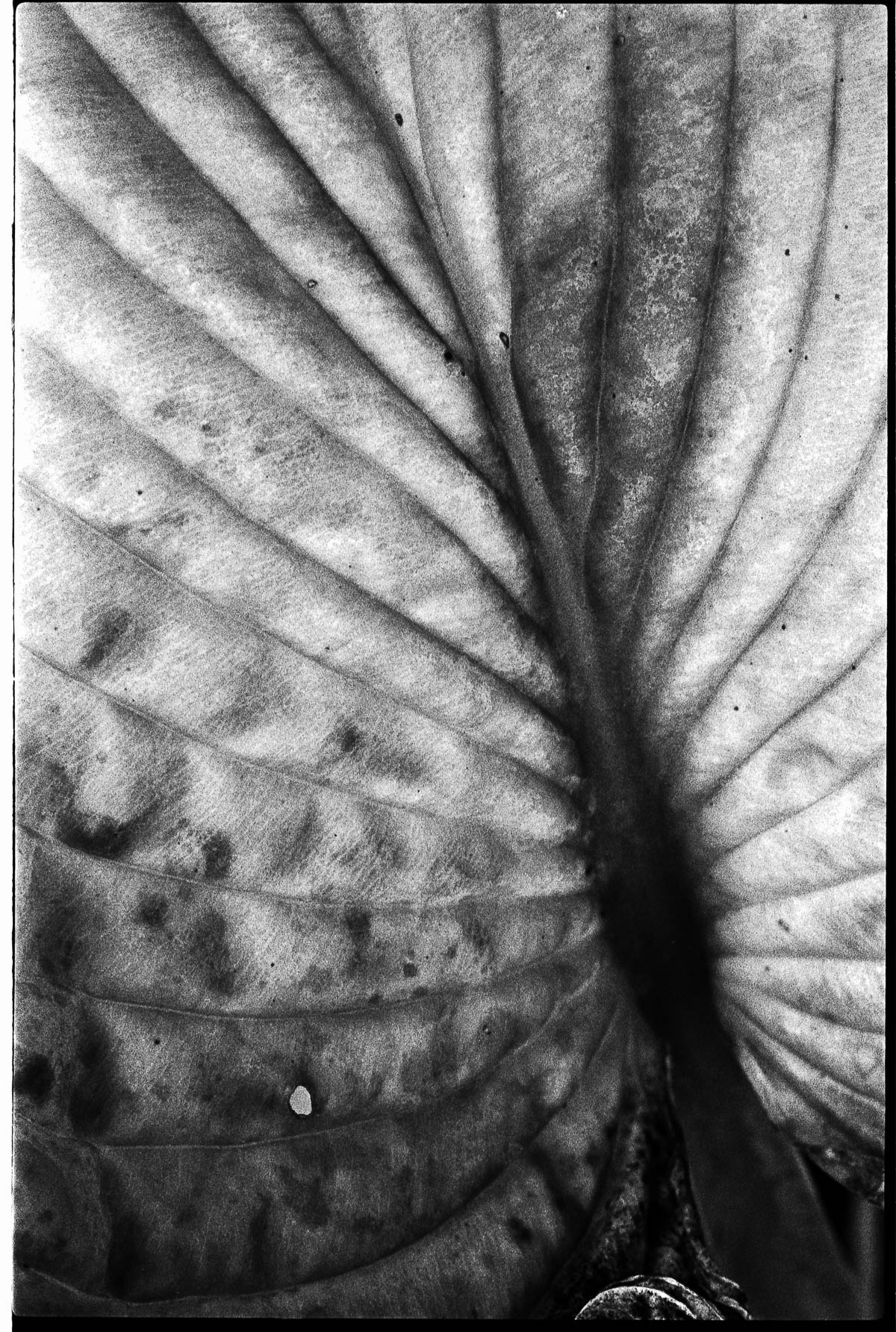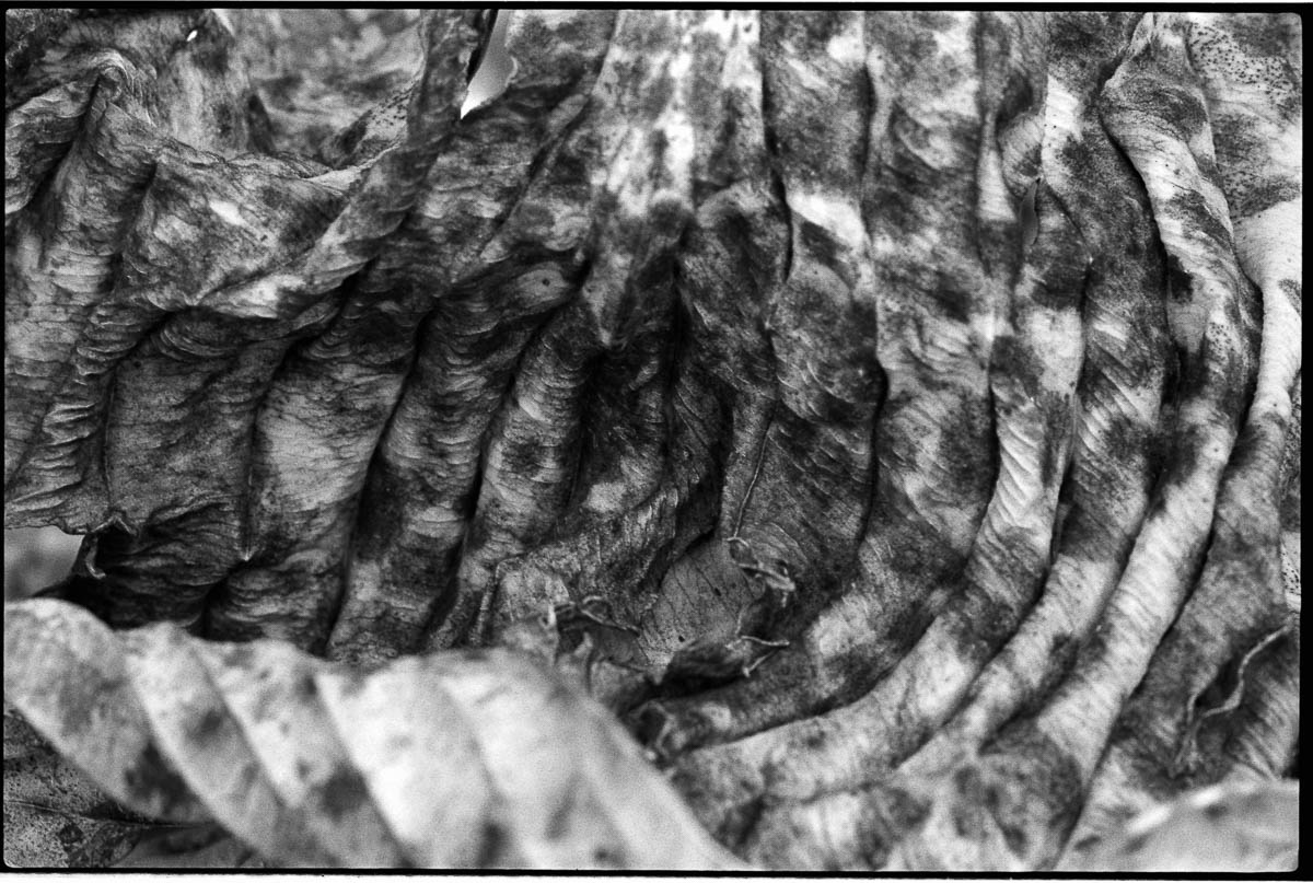 Belichtet mit einer Canon A1, FDn 4,0/100mm Makro, entwickelt in Caffenol Delta für 12:00, gescannt mit Vuescan und Epson 700, bearbeitet in Lightroom mit Negative Lab Pro. Verwelkte Blätter einer Fuchsie im Garten.