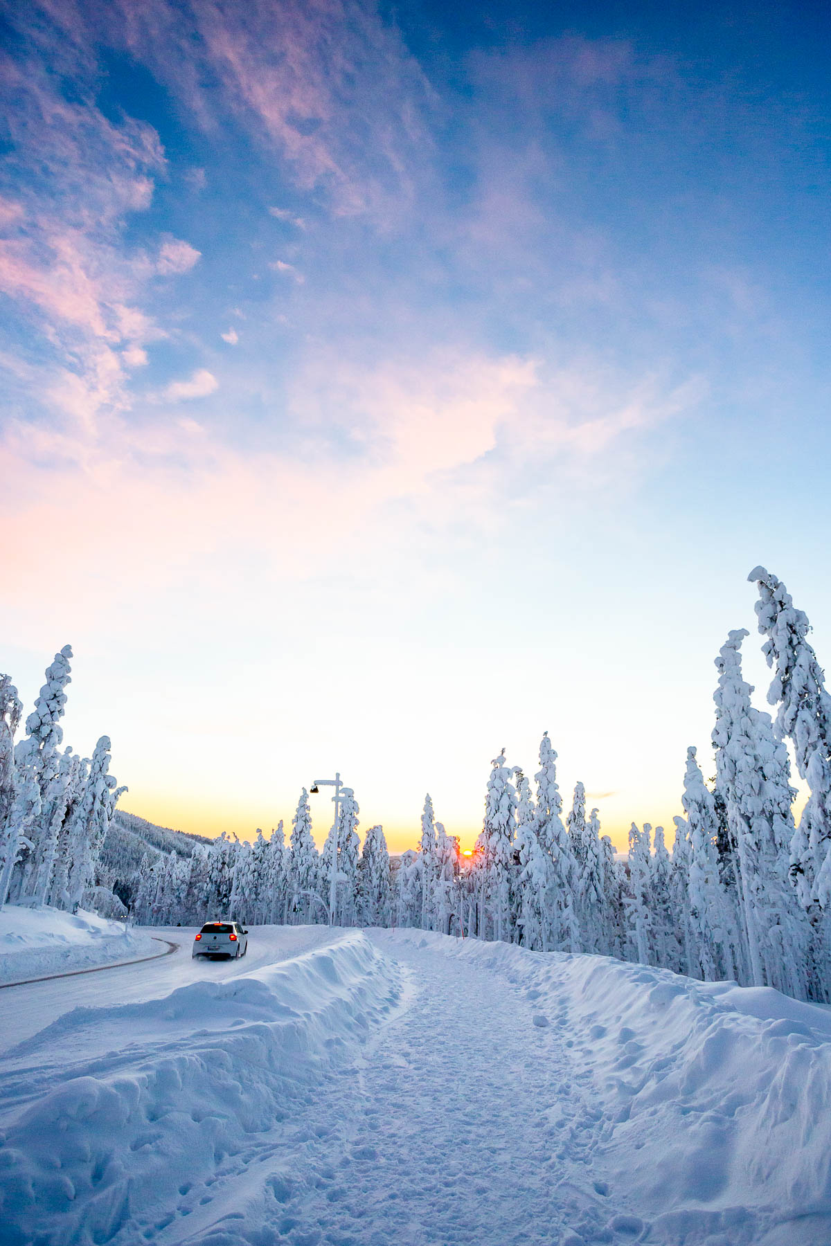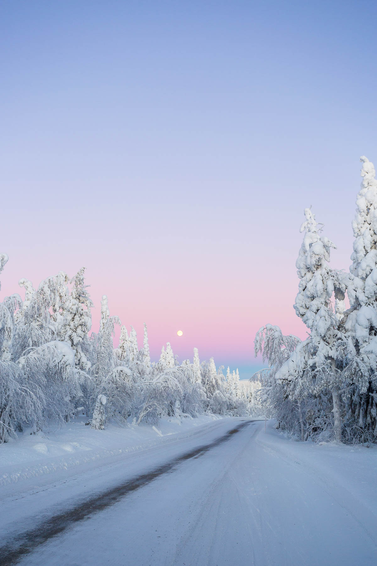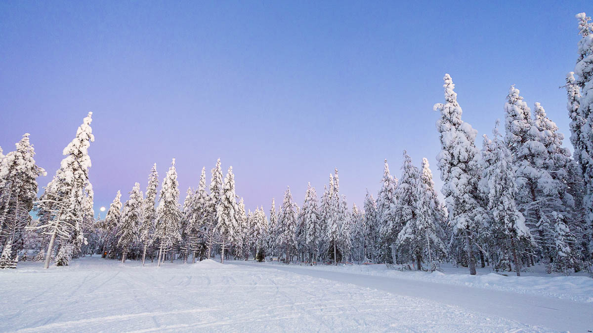 Ich ärgere mich aber trotzdem nicht, denn das Erlebnis, mit vielen Schichten wärmender Wäsche bei -17° durch die dämmerblaue Winterlandschaft zu laufen, ist auch ohne Aurora beeindruckend! Der Sonnenaufgang war gegen 12 Uhr mittags, kurz vor 1 ging sie schon wieder unter – allerdings zieht sich die Dämmerung recht lange hin, sodass es ab 10 Uhr und bis etwa 14:30 annehmbar hell ist. Auch über mittag kommt die Sonne kaum über den Horizont hinaus und genau das führt an klaren Tagen zu einem wunderschönen, magischen Licht. Hell, frostig-blau und mit einem zarten rosa Anstrich versehen. An bewölkten Tagen hingegen ist das Licht derartig flach, dass man kaum irgendwelche Konturen erkennen kann. Dann verschwimmen Landschaft und Himmel in farblosen Weißtönen.