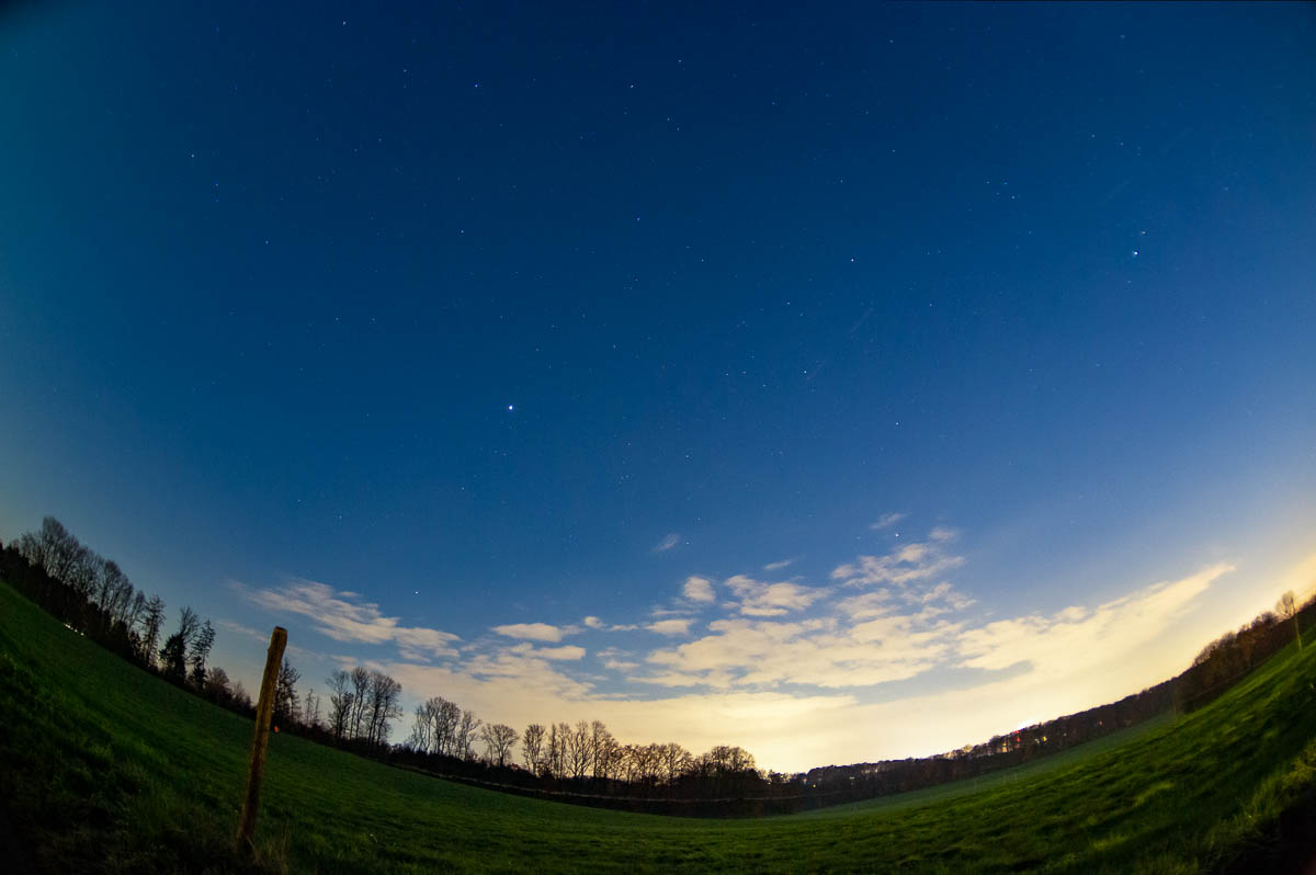 Als die Reisepläne im späten Herbst Form annahmen, war mein erster Gedanke: Wie kann ich die Polarlichter auf analogen Film bannen? Oder wäre es einfacher, mit einer digitalen Kamera zu arbeiten. Ich machte also mehrmals Experimente und fotografierte außerhalb von Bergisch Gladbach den Nachthimmel. Dabei machte ich einige aufschlussreiche Beobachtungen: Mein Ilford HP5 liess sich leider nicht zufriedenstellend auf ISO 1600 pushen (ich hatte dazu eine Standentwicklung in Caffenol CL ausprobiert). Das Objektiv meiner kleinen digitalen Reisekamera lässt sich über Unendlich hinausdrehen, dann wird es unscharf – es lässt sich also im Dunkeln manuell gar nicht fokussieren. Das adaptierte Fisheye macht zwar interessante Fotos, der Effekt wird aber beim nächsten Bild schon langweilig.