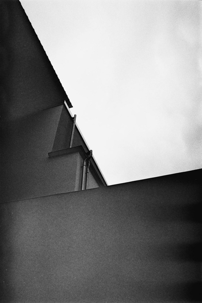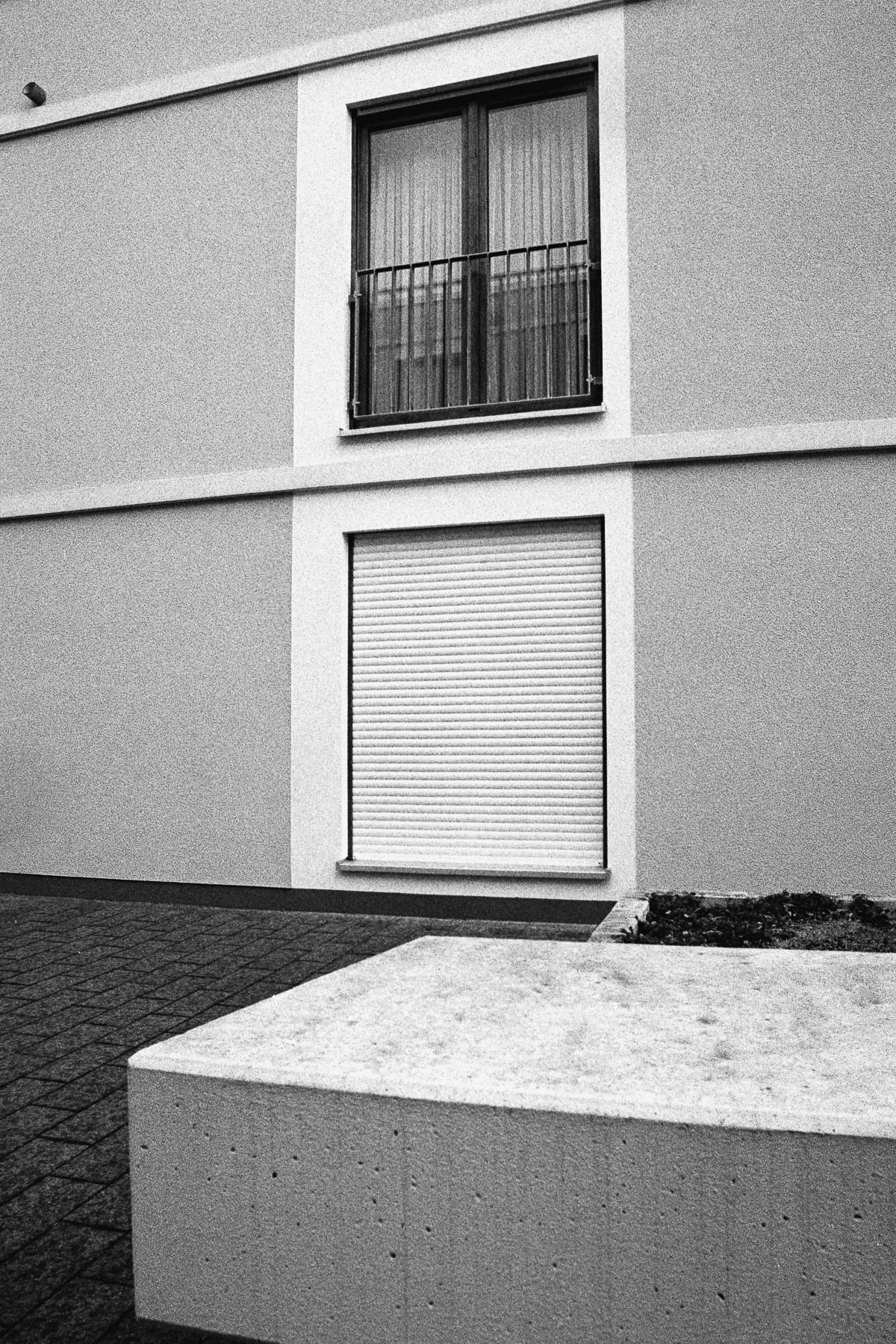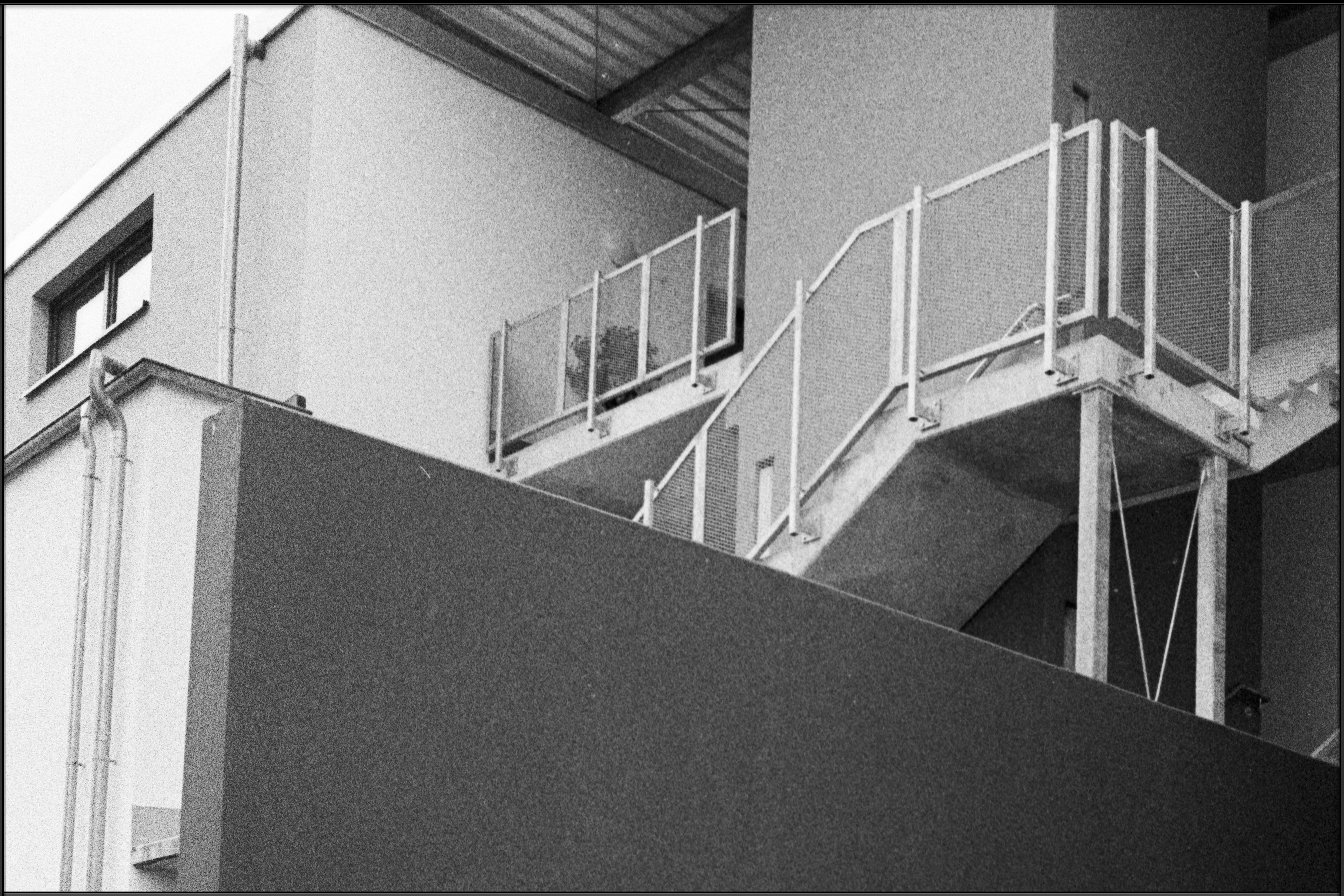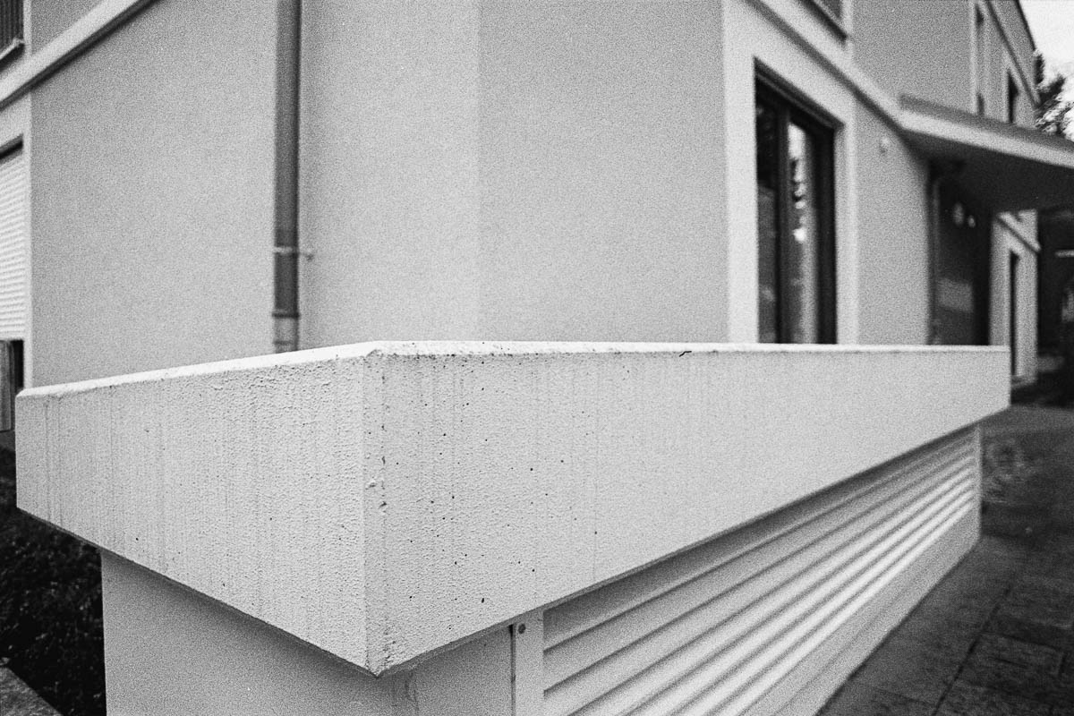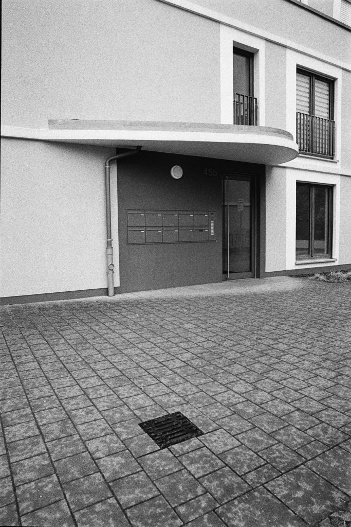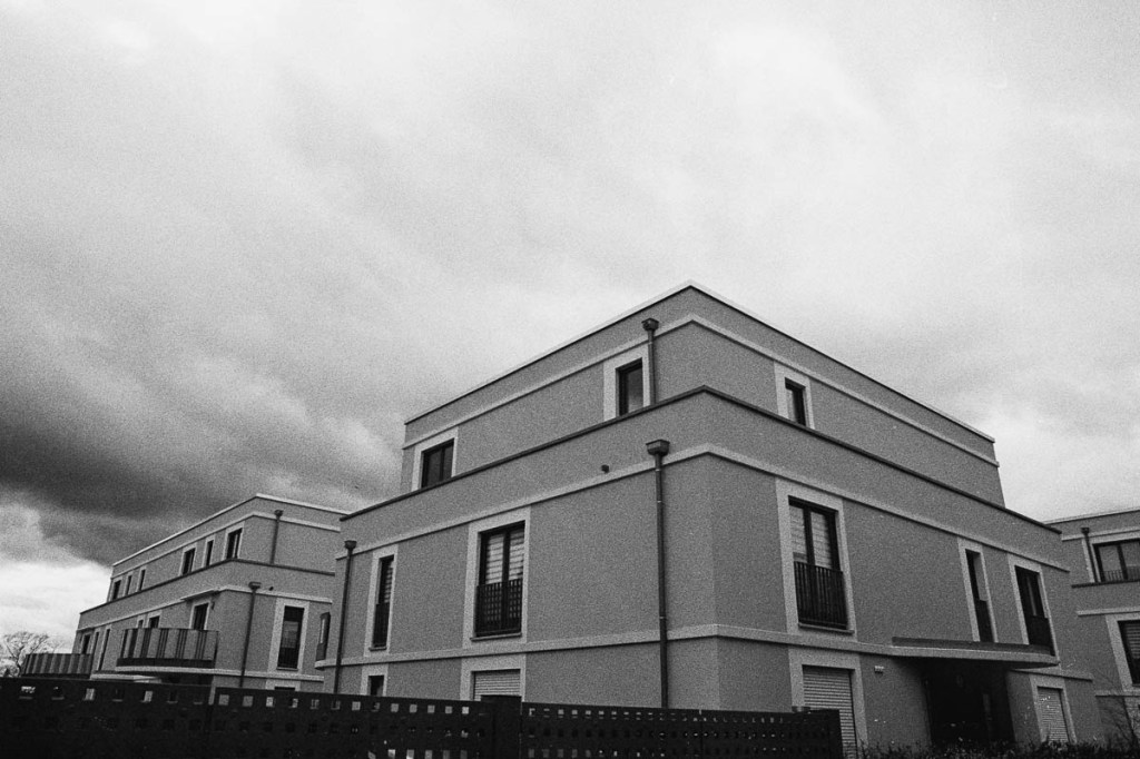 Nachdem ich im Herbst die drei großen Wohnquartiere der Stadt fotografiert habe, die alle aus den 1970er Jahren stammen, wollte ich diese Reihe nun mit den modernen, erst wenige Jahre alten Wohnquartieren fortführen. Wieder analog, wieder in schwarz-weiß und wieder mit dem 24mm-Objektiv. Dass ich zugleich etwas experimentieren würde, war vorauszusehen 😉