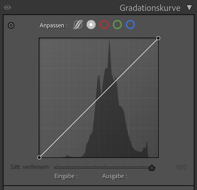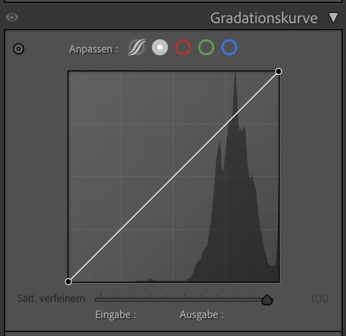 Mir war allerdings aufgefallen, dass die Histogramme der Scans nicht optimal aussahen. Ohne zu sehr in technische Details zu gehen: Der Reflecta kann einen ordentlichen Dichteumfang darstellen und 16-Bit-Dateien können eine große Menge an Graustufen speichern – mehr, als die meisten Negative bieten. Es ist also kein Wunder, dass das Histogramm nicht die komplette Bandbreite füllt. Der Scan sollte aber dennoch alle digitalisierten Graustufen innerhalb des darstellbaren Bereichs speichern, also ein Clipping von sehr hellen oder dunklen Tönen vermeiden. Da ich RAW-Daten speichere, haben die in Vuescan unter dem Reiter „Farbe“ vorgenommenen Einstellungen keinen Einfluss auf die Datei – dies sind Manipulationen der bereits gescannten Daten innerhalb von Vuescan.
