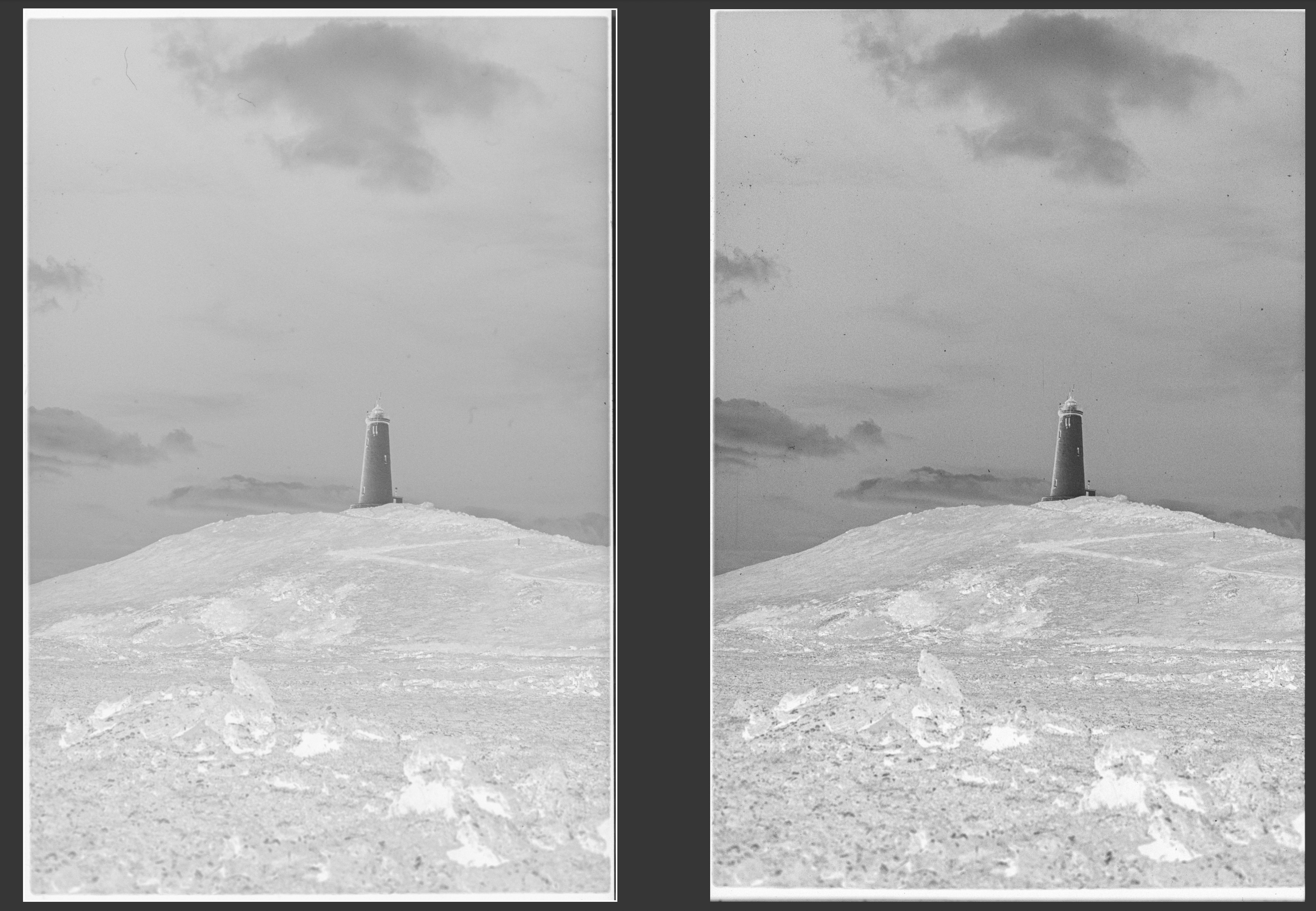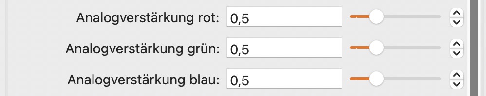 Es gibt in Vuescan aber dennoch eine bedeutende Einstellung, die Einfluss darauf hat, wie hell oder dunkel der Scanner die Vorlagen beleuchtet und digitalisiert – und diese Erkenntnis ist der Grund für meinen Beitrag. Im Bereich „Quelle“ werden nicht nur die Basics angegeben, dort findet man auch Einstellmöglichkeiten für die „Analogverstärkung“. Da meine RAW-Files aus Vuescan immer zu hell waren, habe ich hier die Werte auf 0,5 reduziert. Unten zeige ich die beiden unterschiedlichen Ergebnisse und die dazugehörigen Histogramme.