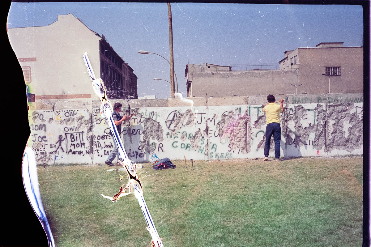 Als ich neulich zufällig über einen Artikel zu Filmsuppen stolperte, fiel mir ein, daß ich mit einiger Wahrscheinlichkeit der unabsichtliche Erfinder dieser Technik bin. Auf einer Klassenfahrt nach Berlin im Frühjahr 1990 hatte ich meine kleine Vivitar Rangefinder-Kamera dabei, die zusammen mit einer Flasche Fanta in meinem Rucksack lag. Das Ergebnis lässt sich bereits ahnen: Durch unsanftes Abstellen zerbrach die Flasche und badete die Kamera und den eingelegten Film. Die Kamera war danach leider kaputt, den Film ließ ich dennoch entwickeln. Und habe nun die Negative herausgesucht und ein paar Scans gemacht. Voila, Film-Soup anno 1990!