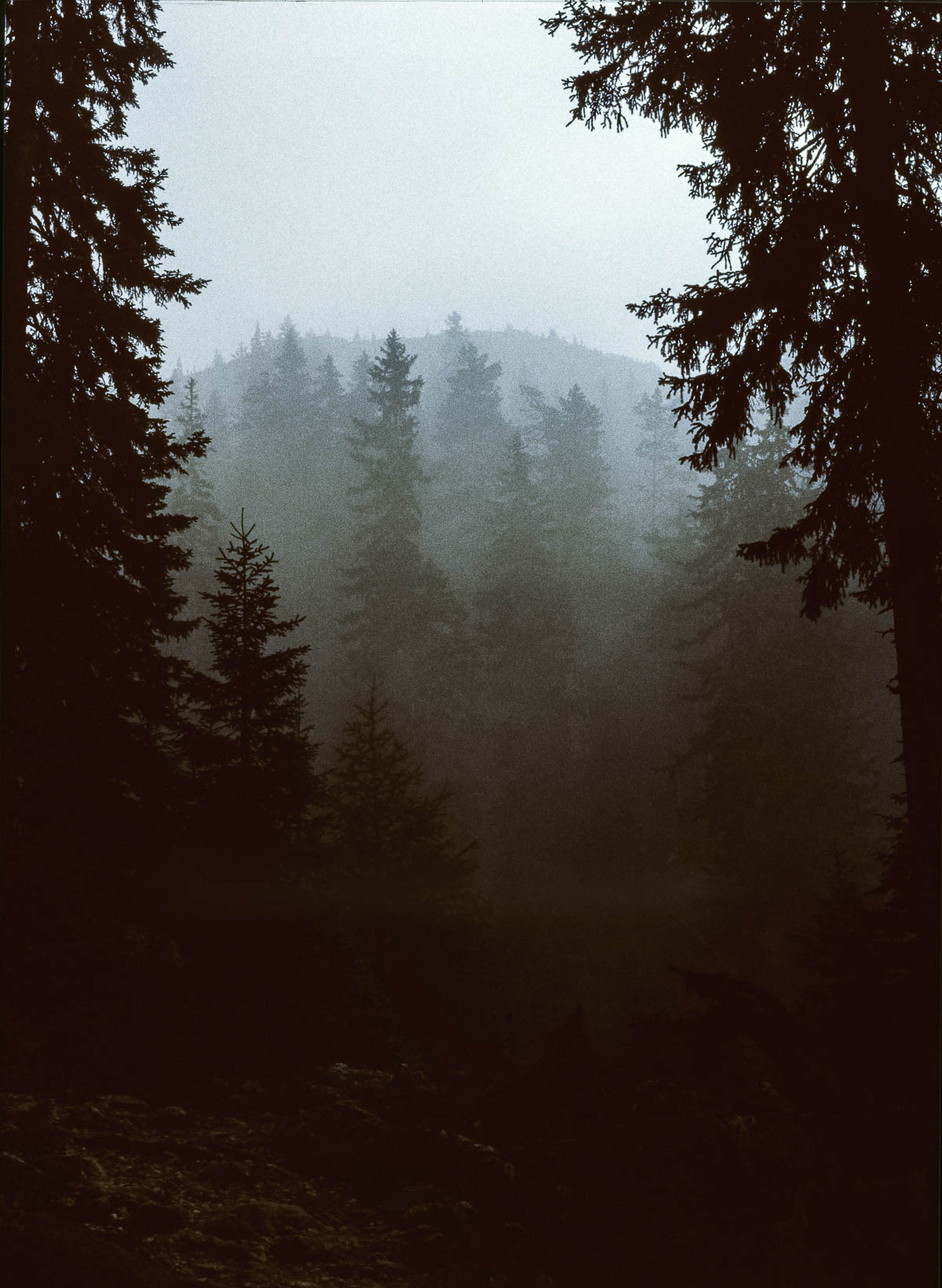 Nachdem mir neulich klar wurde, dass ich seit 40 Jahren „ernsthaft“ fotografiere, möchte ich nun regelmäßig nachsehen, welche Fotos aus früheren Jahren den Test der Zeit bestehen und auch heute noch ansehnlich sind. Ich begebe mich also als erstes zurück in das Orwell-Jahr 1984. Apple stellte den ersten MacIntosh vor und Weizsäcker wurde Bundespräsident. Ich war 11 Jahre alt und hatte grade meine erste eigene Kamera gekauft, eine Konica FC-1 mit einem 1,8/52mm Objektiv. Ein 35er und ein 135er kamen dann noch dazu. Da mein Vater begeisterter Kodachrome-Fotograf war, mir der Film aber zu teuer, belichtete ich stattdessen die damals recht neuen und sehr bunten Fuji-Diafilme. Umkehrfilm hat mich lange begleitet, ich hielt die billigen Farbnegative mit den oft schlechten Großlabor-Abzügen für minderwertig. Später habe ich sehr gerne Ektachrome belichtet, manchmal auch Agfa Scala. Das Dia von 1984, das ich herausgesucht und gescannt habe, zeigt einen nebligen Morgen im Wald – vermutlich waren wir sehr früh zu einer Wanderung aufgebrochen und die Sonne war noch nicht über den Bergkamm geklettert. Auch wenn der Vordergrund wegen des geringen Dynamikumfangs von Diamaterial im Dunkeln verborgen bleibt, finde ich die Tiefenstaffelung und die „Einrahmung“ recht gelungen für so ein Frühwerk 😉