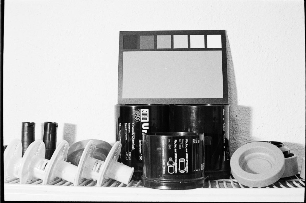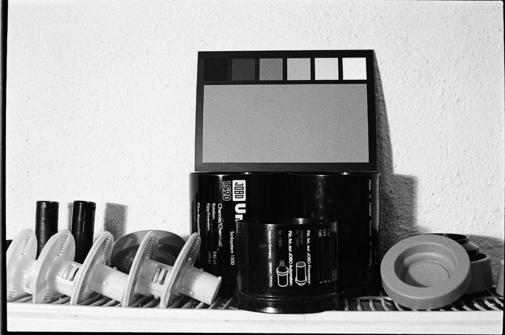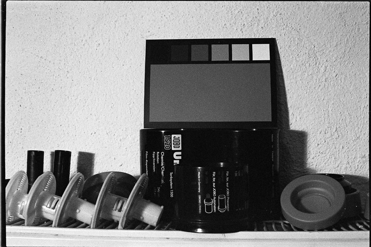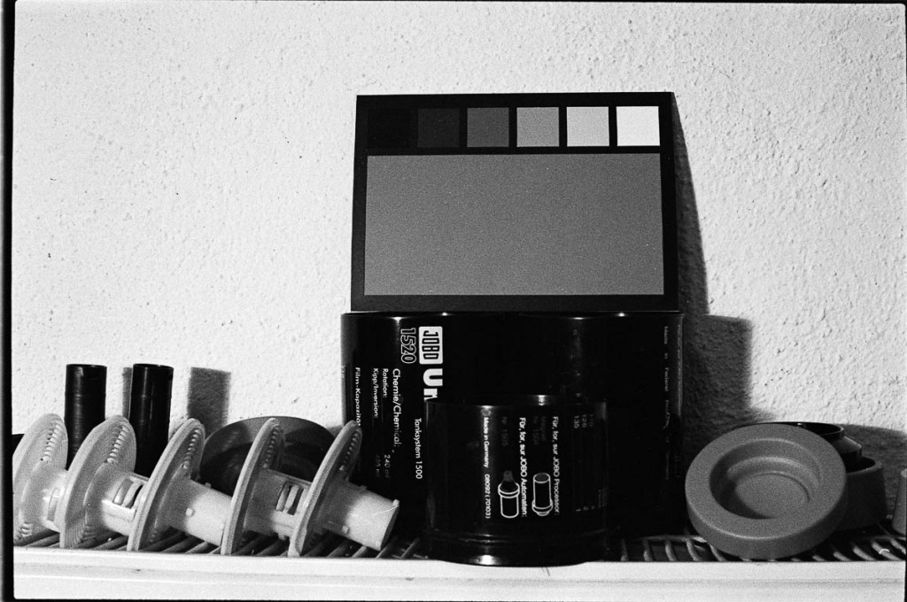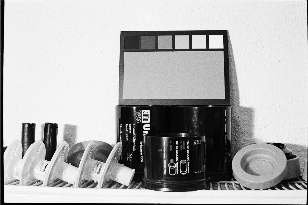 Um zu ermitteln, ob eine Steigerung der Empfindlichkeit stattfindet, habe ich dasselbe Motiv jeweils auf ISO 200, 400, 800, 1600 und 3200 belichtet – vom erwarteten Ergebnis ausgehend also 2 Blenden über- und unterbelichtet. Grade an den Graufeldern der Graukarte kann man sehr schön erkennen, dass die Belichtung auf ISO 800 am ausgewogensten ist. Wie bei CM und CH würde ich empfehlen, bei Filmen ab ISO 400 Jodsalz als Restrainer hinzuzufügen, um den Grauschleier des Films möglichst gering zu halten. Die Kornbildung finde ich im Vergleich zur Delta-Entwicklung kaum gröber und auch die Gradation ist visuell nicht schlecht. Inwieweit sich Caffenol P1 mit anderen Filmen schlägt, bleibt natürlich noch auszutesten 😉 Für FP4 und Pan F werde ich das sicherlich beizeiten mal probieren …