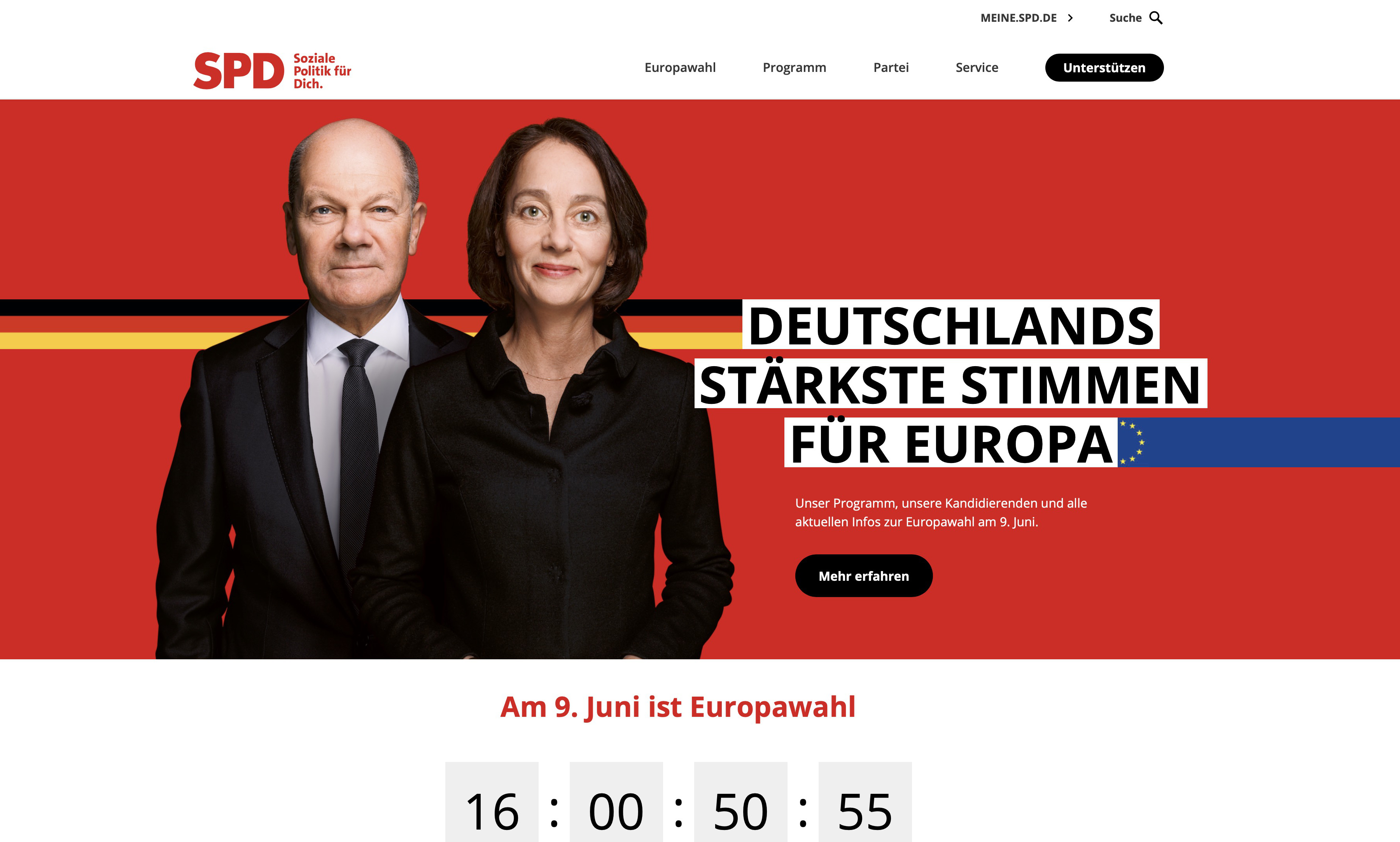 Ob der Wahlkampf der Linken abgeht wie eine Rakete, wird sich zeigen. Die Homepage ist jedenfalls aufgeräumt, unaufgeregt und zeigt nicht einzelne Kandidaten, sondern ein Team. Sympathisch. Das Foto ist modern und sauber fotografiert – die Bildmontage besser ausgeführt als bei Scholz/Barley. Aus ästhetischer Sicht hätte ich keine Einwände.