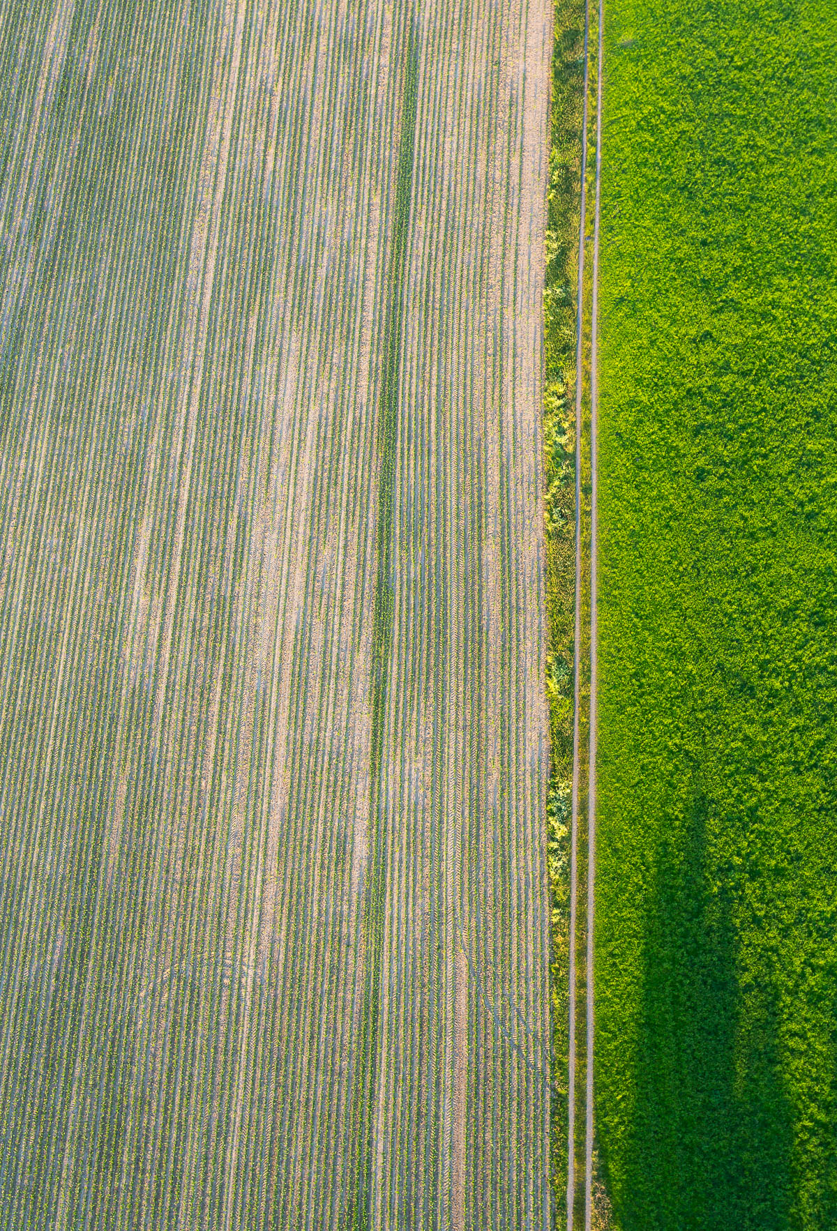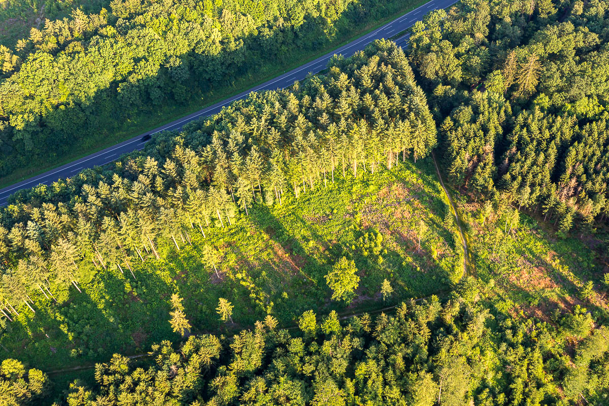 Wer wird denn gleich in die Luft gehen? Ich jedenfalls nicht. Und das kam so: Im vergangenen Jahr bekam ich einen Gutschein für eine Ballonfahrt geschenkt, erst in der vergangenen Woche bin ich dann tatsächlich durch die Luft gefahren und habe „mit dem Feuer die Schwerkraft besiegt“. Ein privates Erlebnis und private Fotos – von denen ich hier aber doch ein paar zeigen möchte. Ganz einfach, weil ich schon während der Ballonfahrt gemerkt habe, dass mich die Weitblicke über das Bergische Land und in den Sonnenuntergang viel weniger faszinierten, als die sachlichen, geometrischen und abstrakten Motive, die ich beim Blick nach unten in Feldern, Wegen und Straßen fand. Schön, den eigenen Stil zu erkennen 😉