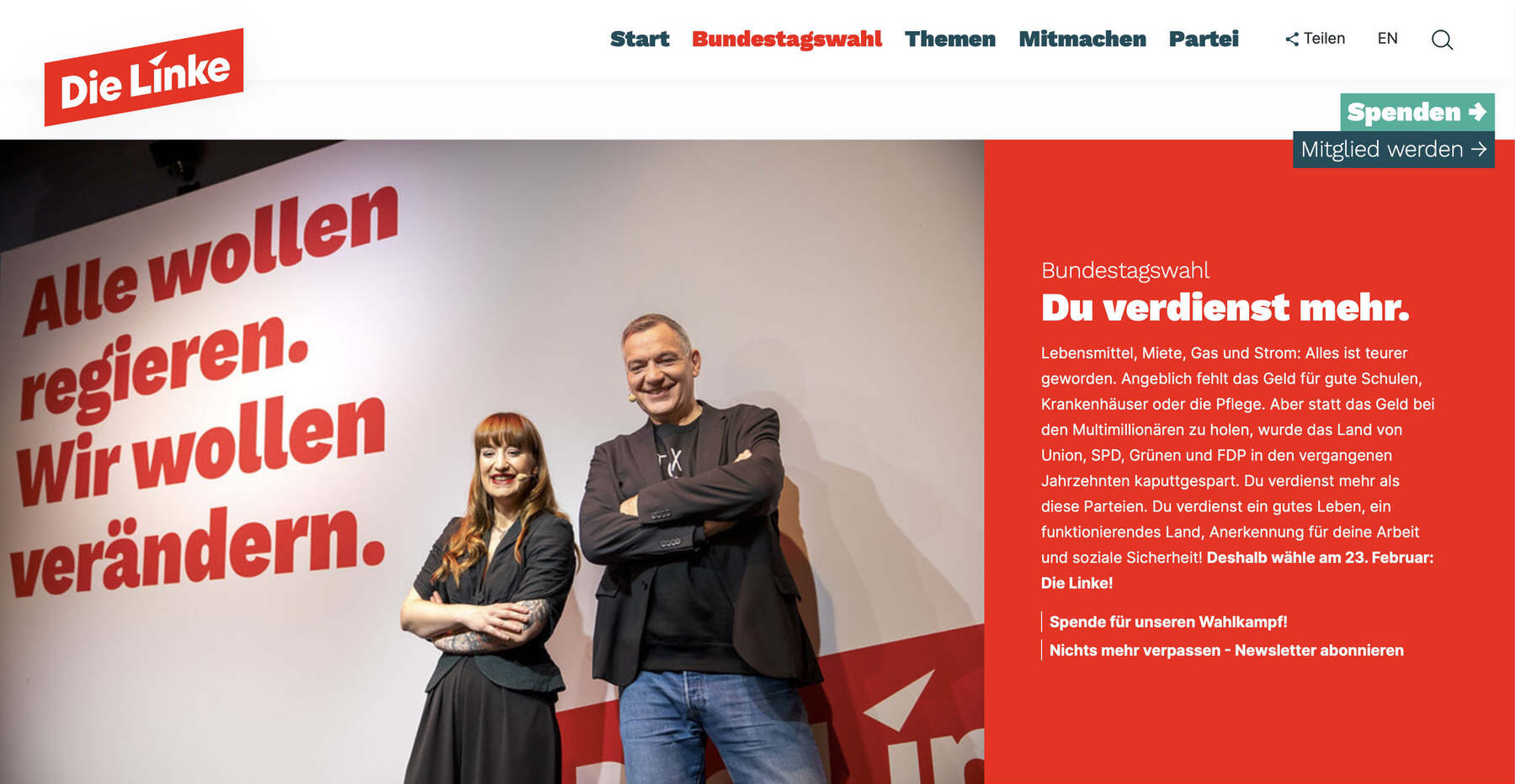 Die Linke macht nicht mit bei der inflationären Aufstellung von Kanzlerkandidaten und zeigt konsequenterweise einen Schnappschuss ihres Führungsduos. Das wirkt lebendig und mittendrin, erfüllt aber keinen höheren künstlerischen Maßstab. Ich finde, die Partei macht sich mit dieser Gestaltung kleiner als nötig – sie ist ja nicht gesichtslos. In einem Wahl-Spot treten Gysi und Ramelow neben der Parteispitze ja auch auf. Dafür gibt es immerhin markante Sprüche zuhauf, die wirklich pointiert sind. Wie erfolgreich man Veränderung herbeiführt, wenn man nicht regieren will, müssen uns die Linken aber noch erklären 😉