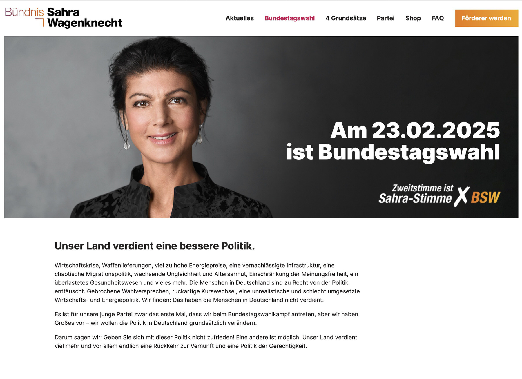 Mit Frau Wagenknecht hatte ich lange ein orthografisches Problem – jetzt weiß ich, was der Fehler ist: Da fehlt ein „a“. Dann heißt es Sahara. Erstaunlicherweise kommt die Dame dann nur ganz leicht dröge rüber. Das Foto stammt aus demselben Shooting wie damals bei der Europawahl. Und es ist wirklich ein sauberes, sympathisches Studioportrait mit guter Lichtführung. Das Bündnis hat aber in ästhetischer Richtung noch etwas vages. Da ist viel Schwarz. Da ist Orange, aber es verläuft ins Gelb. Die Partei hat noch immer keinen handelsüblichen Namen. Statt eines Slogans sehen wir das Datum der Wahl. Das wirkt alles unfertig. Inhaltlich wurde allerdings in den jüngsten Abstimmungen eine politische Linie sichtbar.
