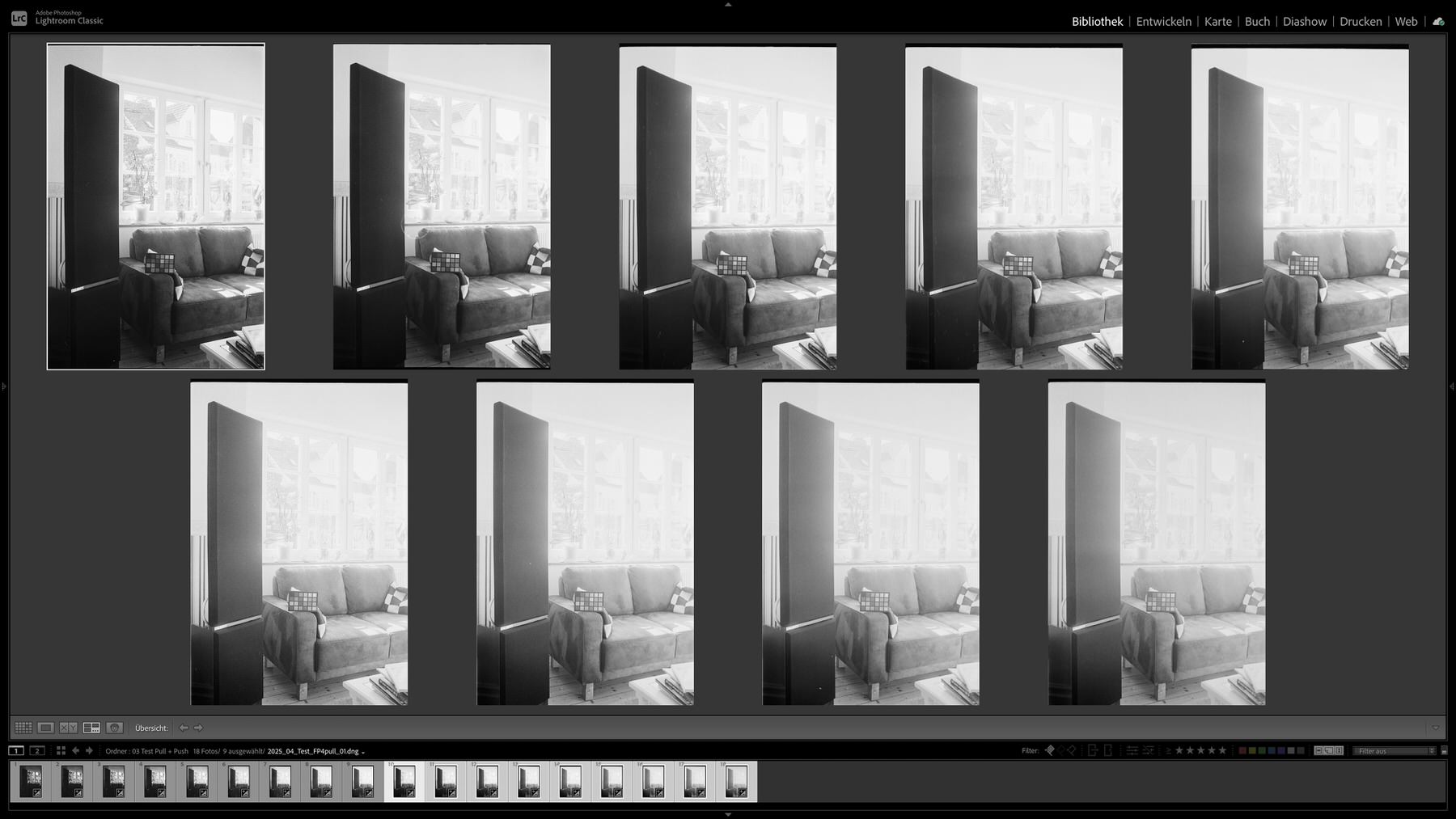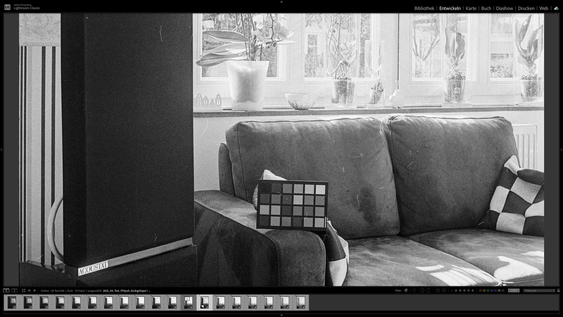 Bei den Fotos, die in Lightroom mit Negative Lab Pro konvertiert wurden, gefällt mir augenscheinlich die Belichtung auf ISO 50 am besten (obere Reihe, mittleres Bild). Wenn ich die Negative auf dem Leuchttisch ansehe, würde auch die für ISO 25 gemessene Belichtung passen. Meine Vermutung ist aber: Caffenol CM ist eine ziemlich heiße Mischung und daher vielleicht nicht so gut zum Pullen geeignet. Ein weiterer Versuch mit Caffenol Delta (dem etwas harmloseren Bruder) würde sich anbieten.